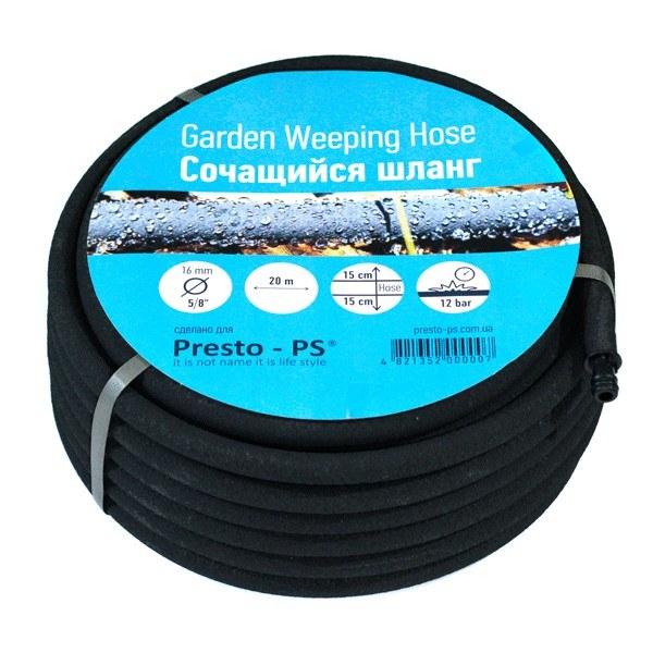Шланг, що сочиться Presto-PS (1352) діаметром 16 мм (5/8") довжиною 20 метрів виготовлений з високоякісного пористого ПВХ. Він стійкий до дії води, прямих сонячних променів. Щільна стінка шланга завтовшки 2 мм робить шланг не схильним до зминання і перегинів. Це дає можливість його використання підземного на глибині 15-20 см, при якому досягається економія витрат води до 70% за рахунок відсутності її випаровування з поверхні ґрунту, яке характерно для стандартних способів зрошення. При наземному варіанті застосування витрата знижується до 50% завдяки використанню крапельного, а не струминного методу поливу. Витрата води можна регулювати в широких межах від 1 до 25 літрів на годину на погонний метр в залежності від тиску в системі. Працює шланг навіть при відсутності централізованого водопостачання з ємності на висоті від 1,5 метрів.